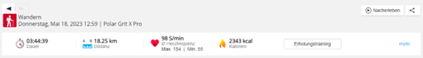 In der restlichen Zeit war meine Herzfrequenz so niedrig, dass sie noch unter dem Bereich 1 (grauer Balken, Regeneration) lag und somit keinerlei Trainingseffekt zugeordnet werden kann. Es war also mein normaler Alltags- Puls, bei dem mein Körper in keiner Weise gefordert wurde und daher auch keine Adaption an das Herz-Kreislauf-System stattfinden wird. Dies ist selbstverständlich auch meinem insgesamt gemütlichen Wandertempo geschuldet. Wäre ich strammer marschiert, wären die Verteilungen insgesamt anders.