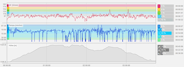 Auf den ersten Blick fällt auf – Ich habe auf dieser Wanderung mit 3 Stunden und 44 Minuten Dauer insgesamt weniger als 2 Minuten in meinem Trainingsbereich von 70% (Bereich 3) verbracht, der meine Herz-Kreislaufleistung im Sinne eines Ausdauerleistung gezielt verbessern und trainieren würde.